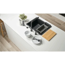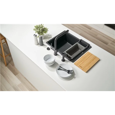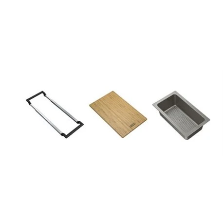 Lot accessoires All-In Set 1 ref 084603 de Franke, idéal pour préparer, cuisiner, nettoyer et ranger. Lot comprenant un rail télescopique extensible de 34 à 54 cm, une planche à découper en bambou, un panier égouttoir en plastique recyclable. Code FUN: 112.0655.481. Code EAN: 7612986084603