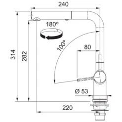 Mitigeur cuisine Active L solution fenêtre chromé, ref 056488 de Franke. Mitigeur escamotable à douchette double jet, hauteur sous fenêtre minimum de 55 mm, rotation du bec sur 180°, embase ø50 mm, perçage ø35 mm, levier de commande 0/100°, débit 7,5 L/min, flexible de douchette nylon tressé, cartouche éco. Code EAN: 7612986056488. Code FUN: 115.0653.391.