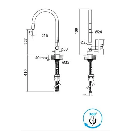 Mitigeur cuisine Ambient ref 603090 à mousseur monojet extractible Chrome/Noir mat de Franke, à douchette double jet, rotation du bec sur 360°. Embase ø 50 mm. Perçage ø 35 mm. Levier de commande + 45°/ – 45°. Débit : 8,3 ltr / min. Douchette en laiton. Flexible de douchette tressé. Code EAN: 7612981603090. Code FUN: 115.0373.950.