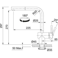 Mitigeur cuisine Atlas Neo Sensor ref 886864 Inox, douchette monojet de Franke, système de mise en marche sans contact (avec capteurs infrarouges). Rotation du bec sur 180°. Embase ø 45 mm. Perçage ø 35 mm. Levier de commande : -6°/ +90°. Débit : 9,7 ltr / min (3 bars). Ecoulement laminaire. Flexible de douchette tressé (1,5 m). Système de fixation avec corps fileté. Code FUN: 115.0625.523. Code EAN: 7612985886864