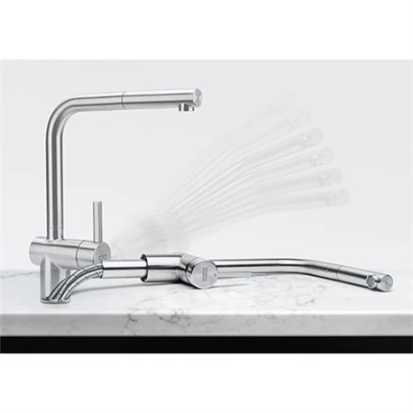 Mitigeur cuisine escamotable à douchette monojet extractible inox référence 444910 de Franke, Atlas Néo solution fenêtre, flexible de douchette tressé, hauteur sous fenêtre minimum 60 mm, rotation du bec sur 180°, embase Ø45 mm, perçage Ø35 mm, débit 8,2 L/min, 3 bar, hauteur 297 mm, code EAN: 7612985444910. Ecoulement laminaire, système de fixation à corps fileté. Code FUN: 115.0521.439.