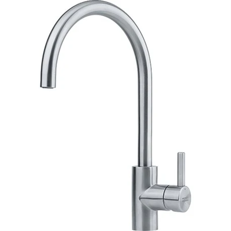 Mitigeur cuisine Eos Neo à bec de Franke, coloris inox, ref 727983. Rotation du bec sur 180°. Embase ø 45 mm. Perçage ø 35 mm. Levier de commande 0°/ 90°. Débit 12,8 L/min (3 bars). Ecoulement laminaire. Système de fixation avec corps fileté. Code EAN: 7612985727983, code FUN: 115.0590.044