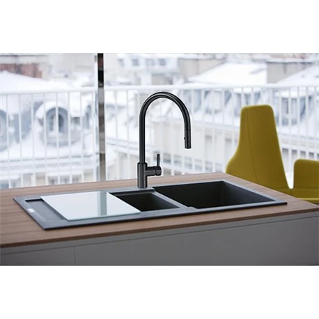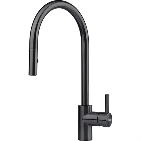 Mitigeur cuisine Eos Neo à douchette double jet de Franke, coloris inox noir, ref 820479. Il s’agit d’un traitement de surface de grande qualité qui confère une résistance et une durée de vie accrues au mitigeur. Cette technologie rend nos mitigeurs de couleur résistants à l’usure, aux produits chimiques, à la corrosion et aux rayures. Rotation du bec sur 180°. Embase ø 45 mm. Perçage ø 35 mm. Levier de commande 0°/ 90°. Débit 10,4 L/min (3 bars). Flexible de douchette tressé : 1,5 m. Ecoulement laminaire. Système de fixation avec corps fileté. Code EAN: 7612985820479, code FUN: 115.0613.671