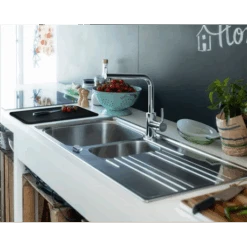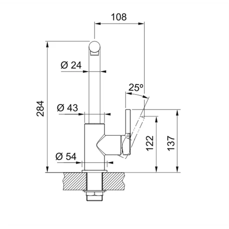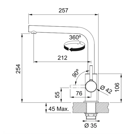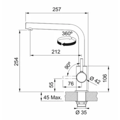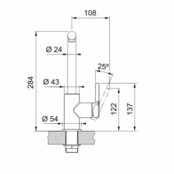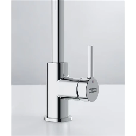 Mitigeur cuisine Lina L de Franke à bec, ref 294590, coloris chrome. Rotation du bec sur 360°. Embase ø 54 mm. Perçage ø 35 mm; Levier de commande 0° / 90°. Débit 9,8 L/min (3 bars). Code EAN: 7612986294590, code FUN: 115.0693.230