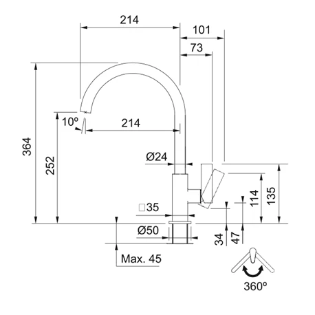 Mitigeur cuisine à bec Maris Neo de Franke réf 451260 coloris chrome, rotation du bec à 360°, levier de commande 0°/90°, embase Ø45 mm, perçage Ø35 mm, débit 10 L/min, hauteur 364 mm, code EAN: 7612985451260. Code FUN: 115.0523.193.