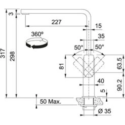 Mitigeur cuisine Mythos ref 543453 Inox de Franke, à bec, rotation du bec sur 360°. Embase 47 x 47 mm. Perçage ø 35 mm. Levier de commande : 50°/ 50°. Débit : 13 ltr / min. Écoulement laminaire. Système de fixation avec corps fileté. Code FUN: 115.0547.852. Code EAN: 7612985543453