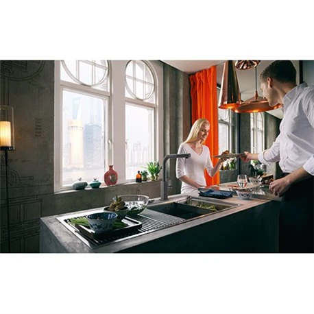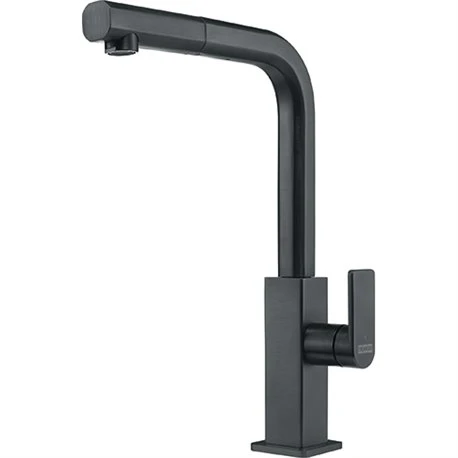 Mitigeur cuisine Mythos ref 552660 Inox Noir, douchette monojet de Franke, à douchette monojet, rotation du bec sur 360°. Embase 47 x 47 mm. Perçage ø 35 mm. Levier de commande : 50°/ 50°. Débit : 9 ltr / min. Écoulement laminaire. Flexible de douchette tressé, longueur 1,5 m. Système de fixation avec corps fileté. Code FUN: 115.0550.442. Code EAN: 7612985552660