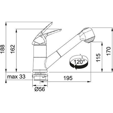 Mitigeur cuisine extractible Novara de Franke, référence 624026. Douchette extractible. Dispositif anti-calcaire sur douchette. Rotation du bec sur 120°. Jet d’eau: Double jet. Embase: Ø 55 mm. Perçage: Ø 35 mm. Dimensions (Lxlxh): 400x185x57 mm. Poids: 2,5 kg. Code EAN: 7612980604026. Coloris Chrome. Normes NF et C3 (Les produits certifiés C3 sont proposés comme solution d’économie d’eau et d’énergie). Code FUN: 115.0380.642.