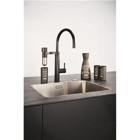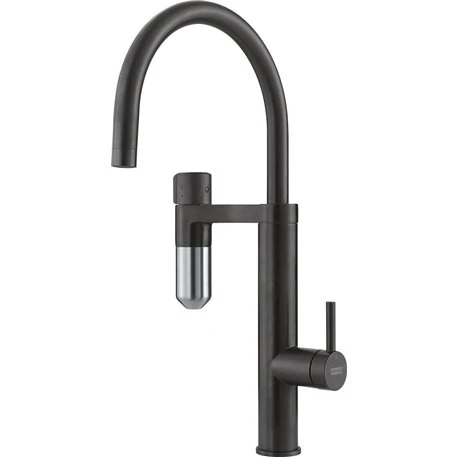 Mitigeur cuisine Vital PVD noir , mitigeur à bec 866903 Franke, 3 en 1 : levier eau chaude, eau froide et système de filtration dissocié. Circuit d’eau filtrée totalement indépendant. Rotation du bec sur 360°, débit 3,5 L/min. 2 cartouches de 500 L incluses, pile pour le timer incluse. Levier de commande 0/90°, hauteur 477 mm. Code FUN: 120.0621.312. Code EAN: 7612985866903