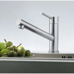 ORBIT , Bec , Levier haut 0°/90° , Tout Inox , INOX , Aérateur Laminar , Cartouche ECO , Rotation bec 360° , Embase 53mm , Perçage 35mm , Débit 13ltr/min , FRANKE , Garantie 5 ans , Disponibilité pieces détachées 7 ans