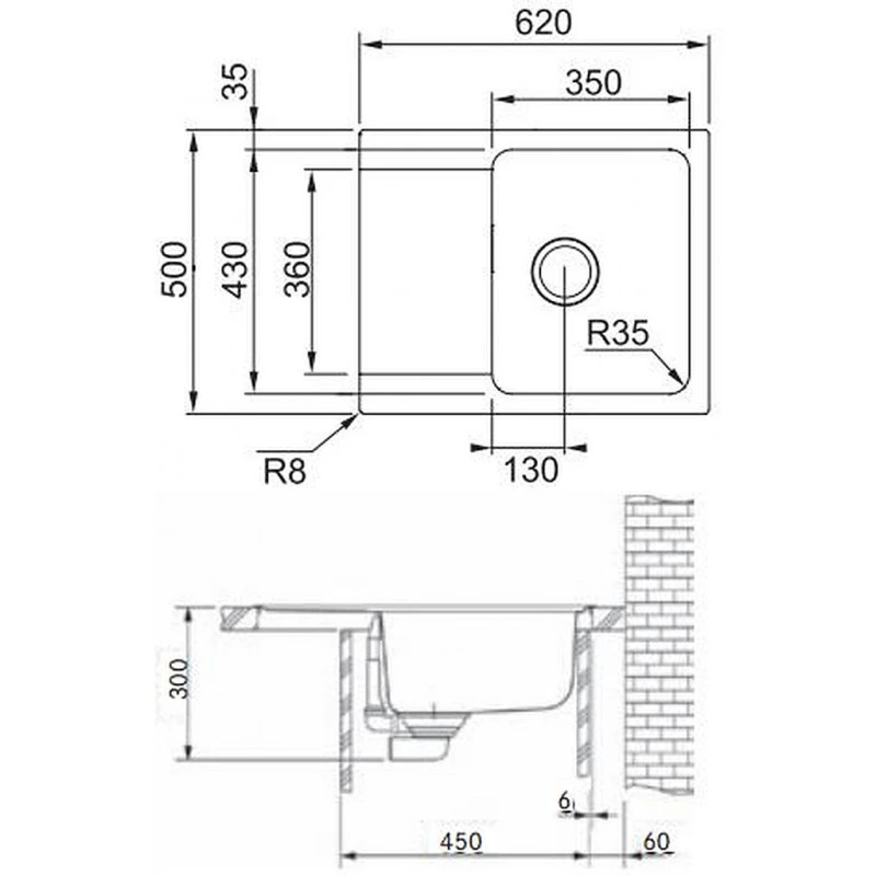 - Dimensions évier: longueur 620 mm
